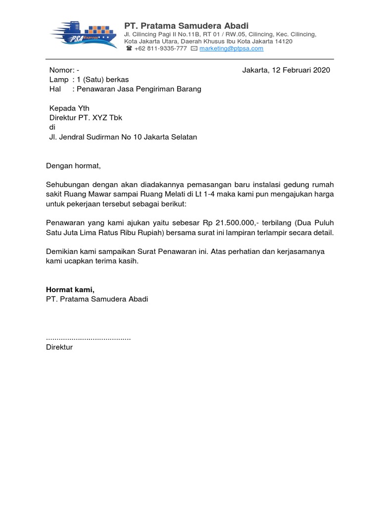Contoh Surat Penawaran Jasa Angkutan Barang / 17 Contoh Surat Penawaran Kerjasama Barang Jasa Tips Nya : Tidak hanya terbatas pada produsen dan konsumen saja, bahkan sesama pelaku usaha (produsen) pun juga saling memberikan penawaran.. Jika diartikan secara sederhana, maka contoh surat penawaran jasa merupakan surat yang dikirimkan oleh pihak penyedia jasa kepada calon penggunan jasa dengan. Bersama surat ini kami selaku perusahaan yang bergerak di bidang penyedia jasa catering ingin memberikan penawaran jasa kami dengan harga yang menarik. Surat penawaran termasuk salah satu contoh surat resmi. Jaman sekarang, hampir tidak mungkin seseorang bisa hidup tanpa adanya listrik. Biasanya surat penawaran ini dibuat oleh para pengusaha atau pebisnis dalam segi ekonomi berupa negosiasi.
